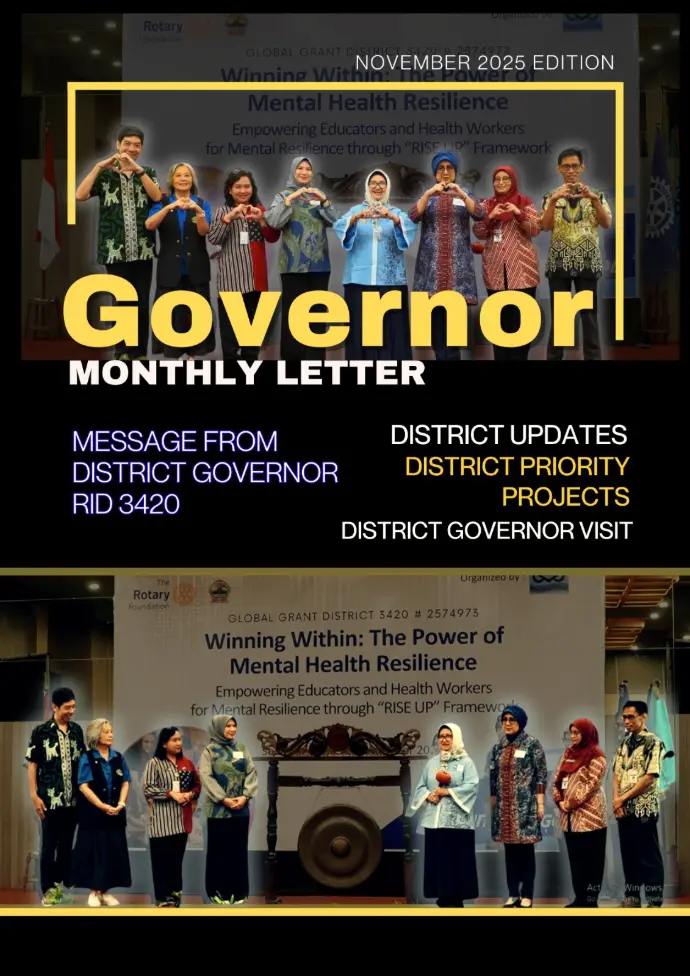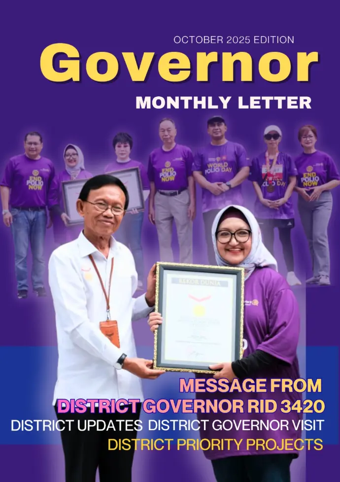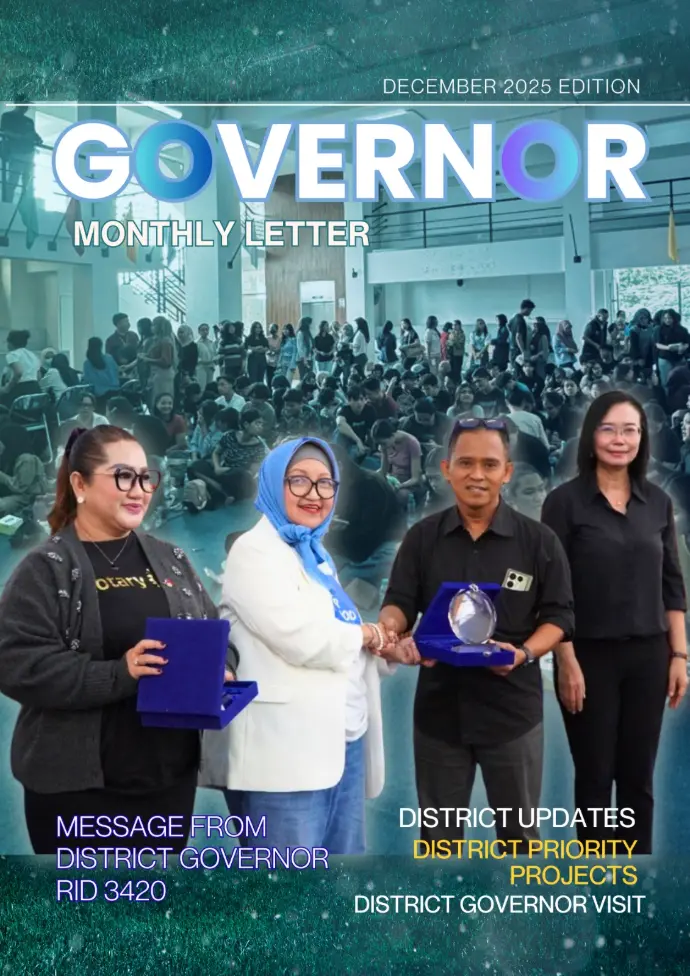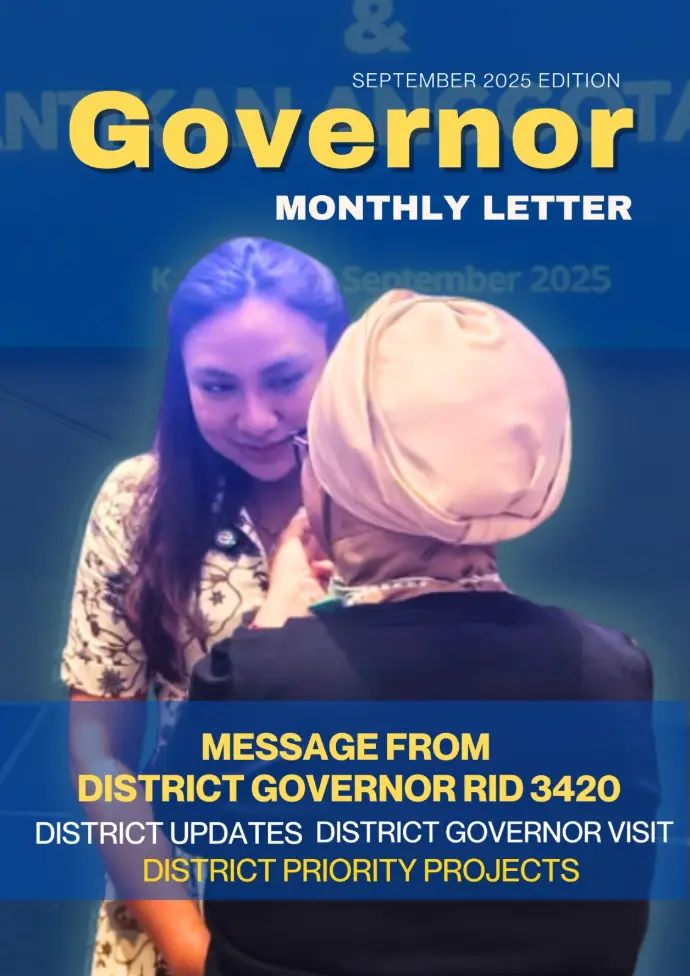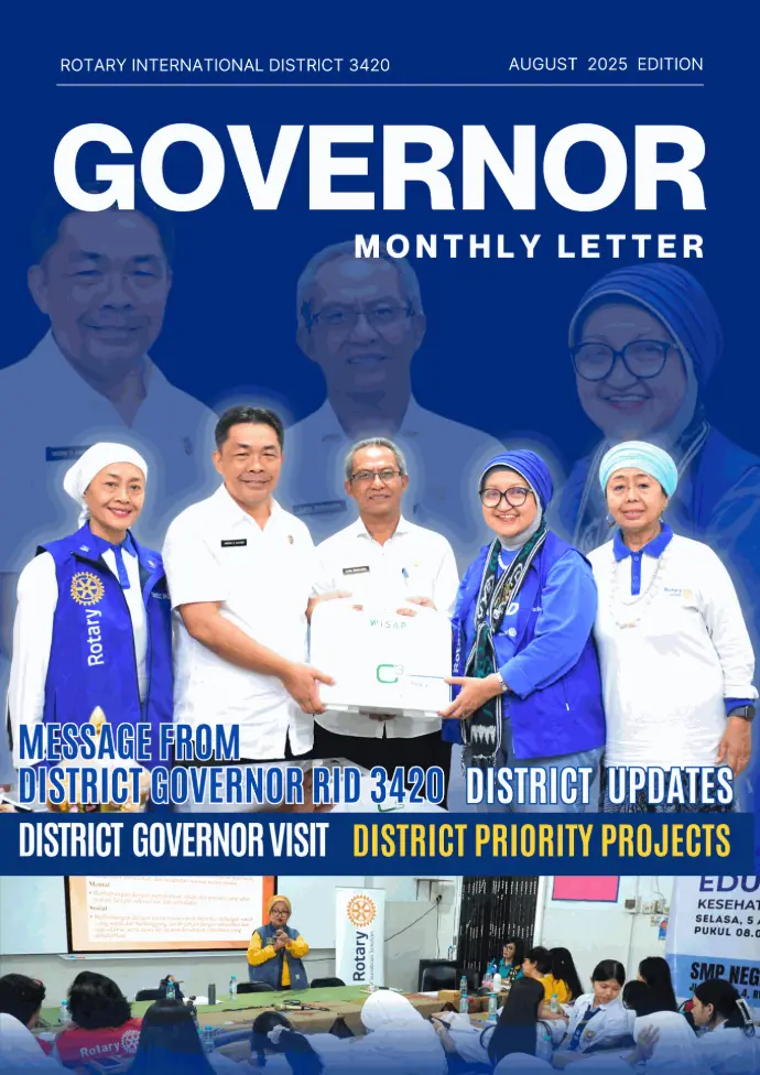 Governor Monthly MessagePesan bulanan dari District Governor memberikan arahan strategis dan motivasi untuk seluruh anggota. GMM adalah pengingat bahwa setiap langkah kecil kita berdampak besar dalam perjalanan Rotary 06 Jan Governor Monthly Message Governor Monthly Letter January 2026 Posted by District 3420 February 22, 2026 0 Continue reading 02 Dec Governor Monthly Message Governor Monthly Message Desember 2025 Posted by District 3420 January 26, 2026 0 Continue reading 05 Nov Governor Monthly Message Governor Monthly Message November 2025 Posted by District 3420 January 26, 2026 0 Continue reading 10 Oct Governor Monthly Message Governor Monthly Message Oktober 2025 Posted by District 3420 January 26, 2026 0 Continue reading 12 Sep Governor Monthly Message Governor Monthly Message September 2025 Posted by District 3420 January 26, 2026 0 Continue reading 17 Aug Governor Monthly Message Governor Monthly Message Agustus 2025 Posted by District 3420 January 26, 2026 0 Continue reading 12 Jul Governor Monthly Message 12 July 2025: DG DYAH ANGGRAENI || Maternal and Child Health || RID 3420 Posted by District 3420 July 31, 2025 0 Fellow Rotary Members,Bulan Juli ini, Rotary mengajak kita semua kembali fokus pada Maternal and Child Health, topik yang takkan bi... Continue reading
