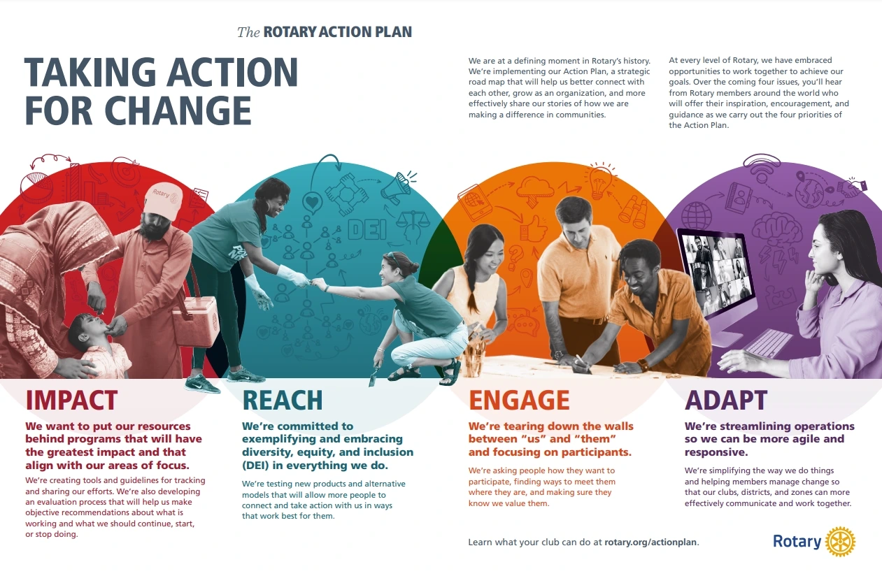 Sejarah, nilai inti seperti Service Above Self dan Four-Way Test, struktur organisasi dari global hingga lokal, serta pengembangan kepemimpinan untuk menciptakan perubahan positif di komunitas.nilai dan prinsip yang kuat.